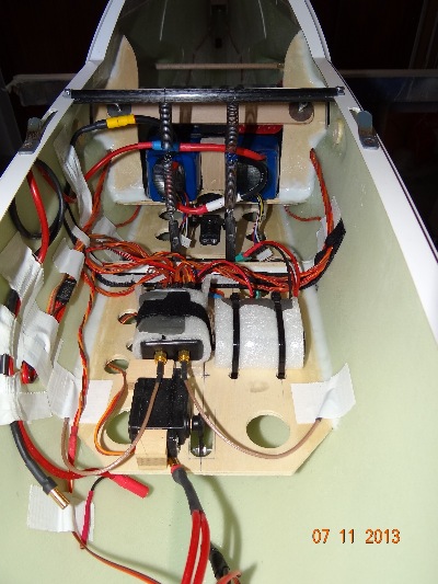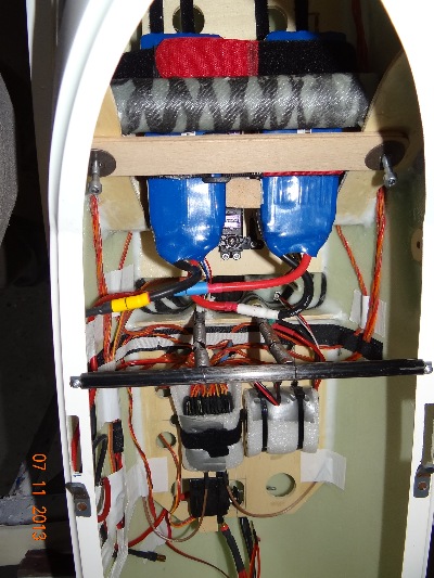 Innenausbau: RC-Anlage, vorderes Servo für die Entriegelung des Ausziehfahrwerks, hintere Servos (2 Stück in Reihe) für die Seidenruderan-anlenkung
